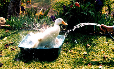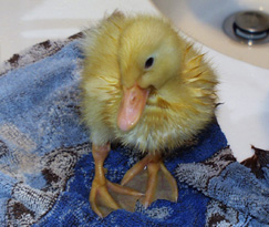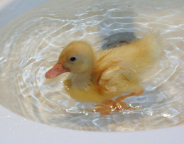 When I was a little duckling, I swam in the bathroom sink! My human mommy always made sure I was warm and dry after my swim. |